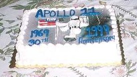 Click on thumbnails to see full-size pictures. Eric had this cake made for the July 20, 1999 party of the Tacoma-Lakewood Coin Club, which happened to fall on the 30th anniversary of the first man on the moon. The cake was made by Something Delicious bakery in Kent, Washington and they did an outstanding job! Leftover cake was also enjoyed at work the next day. Eric holding the cake, with special Apollo 11 quilt (supplied by a fellow TLCC member) in the background. Eric's "The Eagle has Landed" shirt from the Boeing gift shop shows the same scene depicted on the cake.